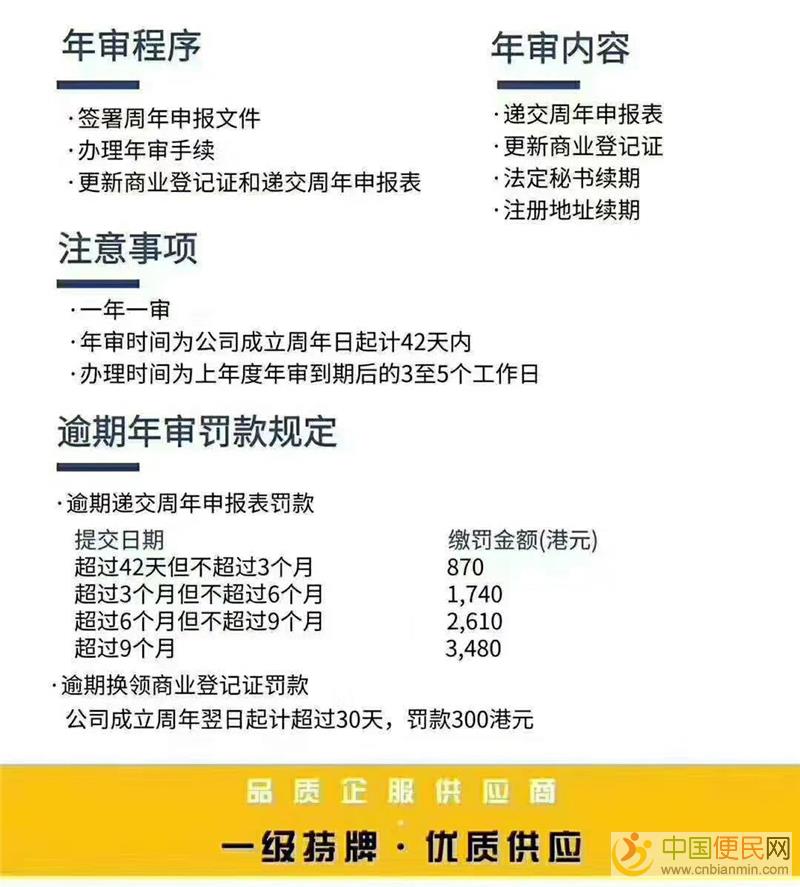 根据香港法律规定,香港公司每年都要例行年审,香港公司年审是指香港政府相关职能部门对香港公司进行每周年一次的资格审查,涉及的范围主要是经营情况、公司情况等方面欢迎www.cnbianmin.com。